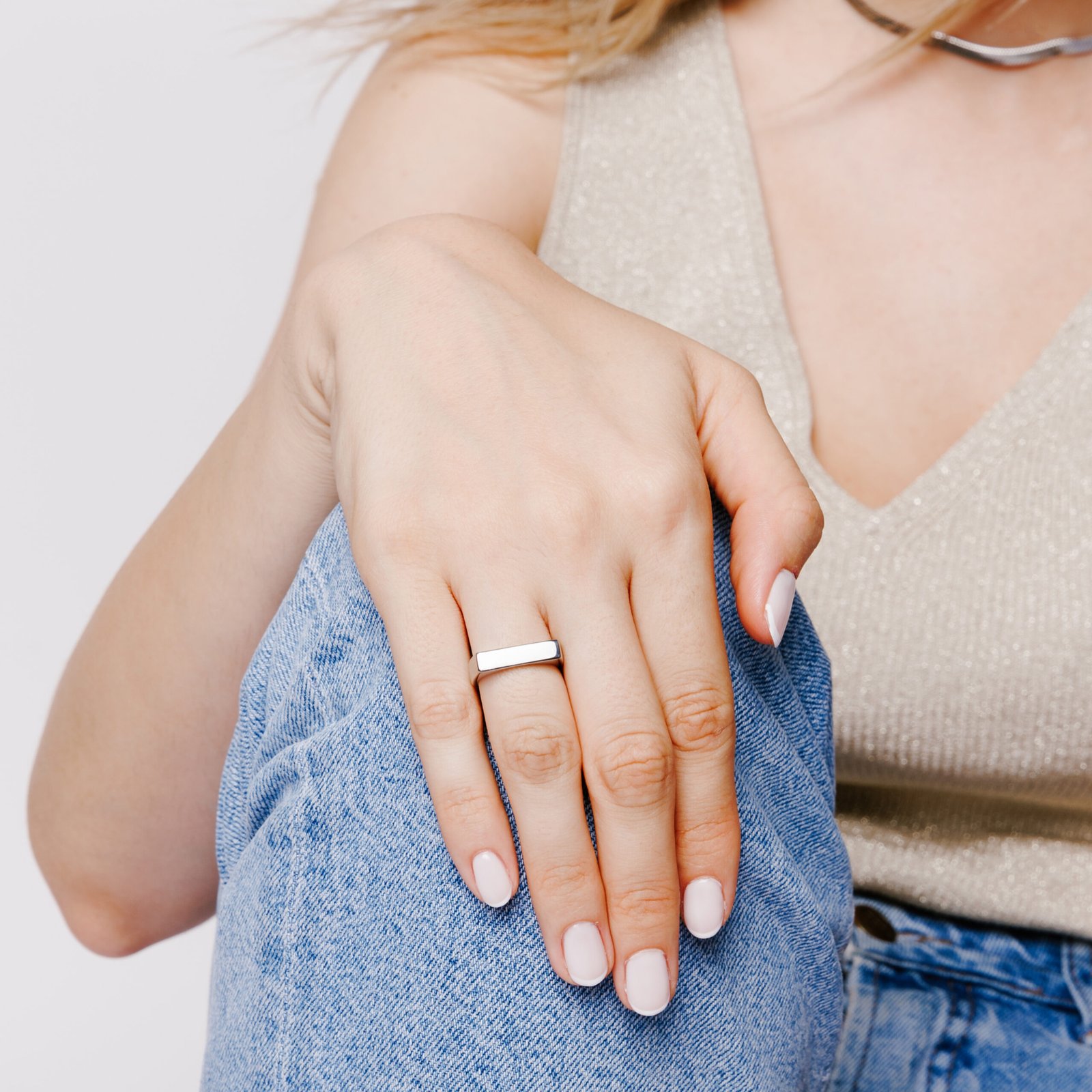 Αναβαθμίστε το στυλ σας με τα εντυπωσιακό ασημί δαχτυλίδι της συλλογής μας, το οποίο αποτελεί την επιτομή της διαχρονικής ομορφιάς και κομψότητας Το δαχτυλίδι διαθέτει ένα απλό και σύγχρονο σχεδιασμό, μ’ ένα κομψό και γεωμετρικό σχήμα και με μια επίπεδη, ορθογώνια πρόσοψη που προσδίδει μια μοντέρνα και μινιμαλιστική αισθητική. Συνδυάζεται εύκολα με άλλα κοσμήματα για μια πιο ολοκληρωμένη εμφάνιση.
