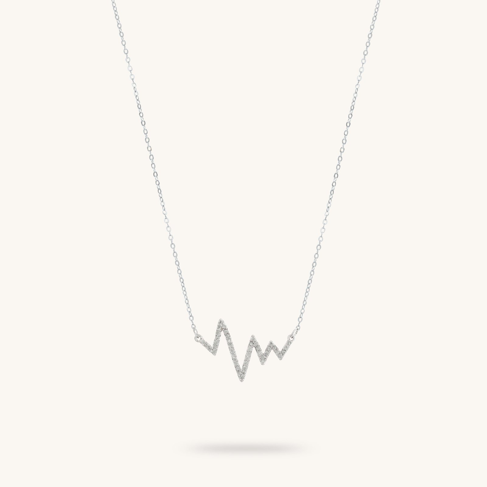 Αναβαθμίστε το στυλ σας με το εκθαμβωτικό ασημί κολιέ της συλλογής μας, που συνδυάζει τη διαχρονική κομψότητα με τη μοντέρνα αισθητική. Το κεντρικό του στοιχείο είναι ένα μοτίβο που αναπαριστά την κυματομορφή ενός καρδιογραφήματος, η οποία είναι διακοσμημένη με μικρά, λαμπερά ζιργκόν, που ενισχύουν τη λάμψη και τη φινέτσα του σχεδίου. Το μοτίβο ισορροπεί τέλεια ανάμεσα στη γεωμετρική απλότητα και τη μοντέρνα πολυτέλεια. Η λεπτή ασημί αλυσίδα συνδυάζεται αρμονικά με τα υπόλοιπα στοιχεία, ενώ το μήκος της προσφέρει άνετη εφαρμογή.
