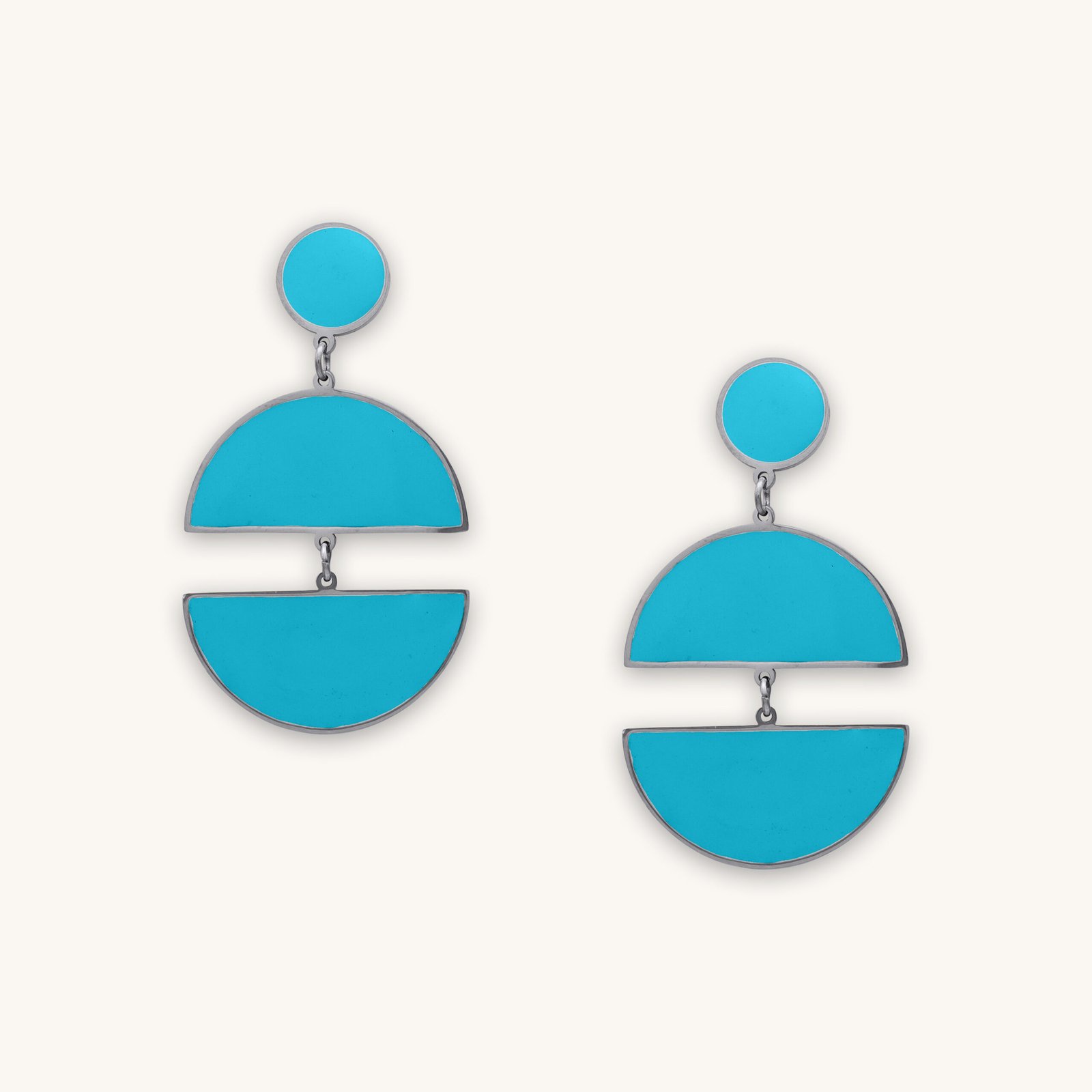 Το γεωμετρικό σχέδιο των σκουλαρικιών αποτελείται από έναν κύκλο και δύο μισοφέγγαρα που ενώνονται με μικρούς κρίκους, δημιουργώντας κίνηση και μοντέρνα αισθητική. Το μοναδικό αυτό σχέδιο προσδίδει μια σύγχρονη και δυναμική εμφάνιση που μπορεί να αναδείξει κάθε εμφάνιση. Η λεία και γυαλιστερή επιφάνεια των σκουλαρικιών αντανακλά το φως, προσδίδοντας μια διακριτική λάμψη που τραβάει τα βλέμματα. Η τιρκουάζ απόχρωση συνδυάζεται αρμονικά με το ασημί χρώμα του ατσαλιού, δημιουργώντας μια ζεστή και πολυτελή εμφάνιση.