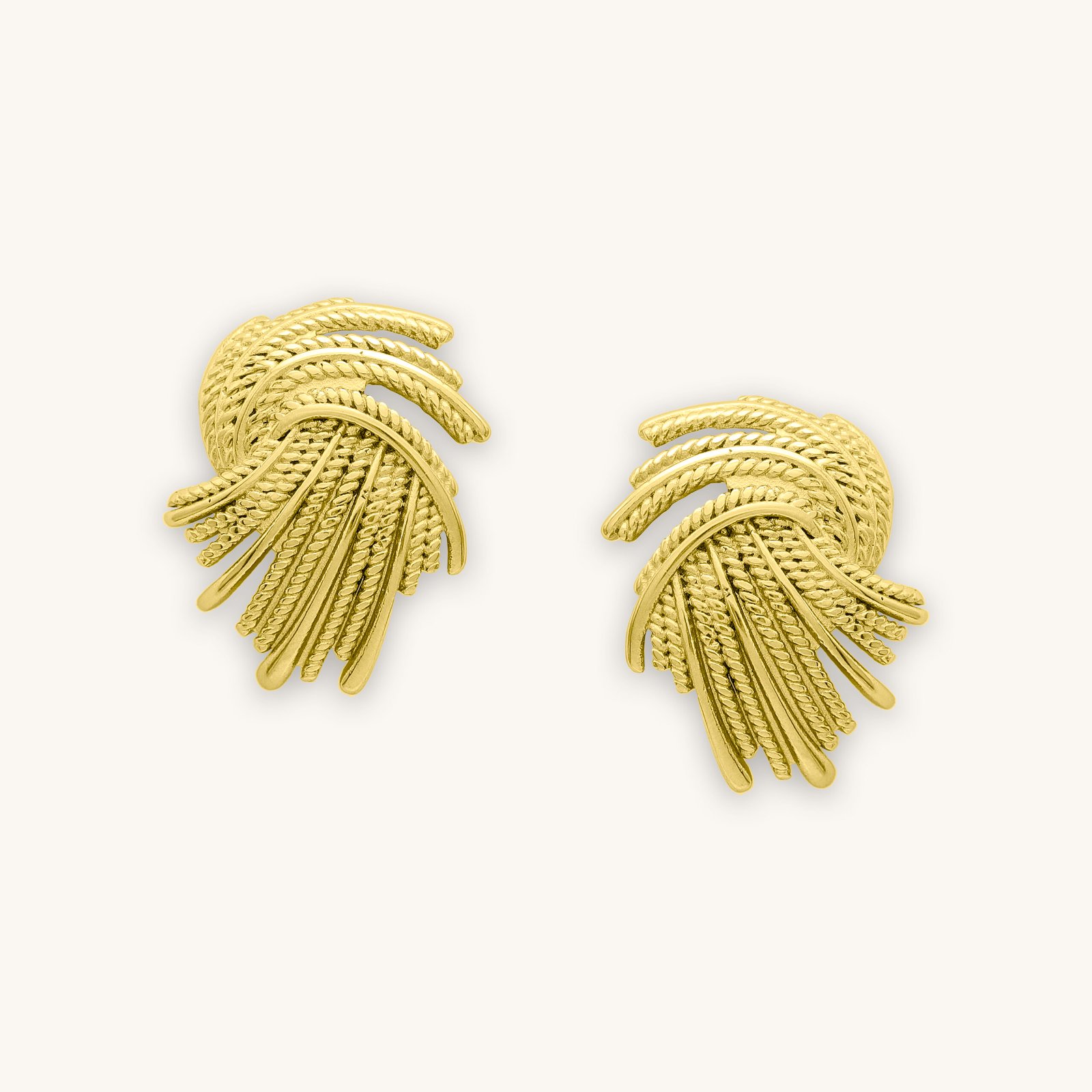 Αναβαθμίστε το στυλ σας με τα εντυπωσιακά χρυσά σκουλαρίκια της συλλογής μας, τα οποία προσφέρουν μια αίσθηση πολυτέλειας και εκλεπτυσμένου στυλ, ιδανικά για όσες αναζητούν την κλασική κομψότητα με μια μοντέρνα πινελιά. Το σχέδιο του σκουλαρικιού αποτελείται από πολλά λεπτά χρυσλα κλαδιά που είναι τοποθετημένα με τρόπο που δημιουργούν έναν περίτεχνο κόμπο. Τα κλαδιά είναι εναλλάξ λεία και σαγρέ, προσδίδοντας μια ενδιαφέρουσα υφή και διάσταση στο κόσμημα. Τα σαγρέ κλαδιά έχουν μια λεπτομερή χάραξη που θυμίζει σχοινί, ενώ τα λεία κλαδιά έχουν μια γυαλιστερή επιφάνεια που αντανακλά το φως. Ο συνδυασμός αυτών των δύο υφών δημιουργεί ένα εντυπωσιακό οπτικό αποτέλεσμα.