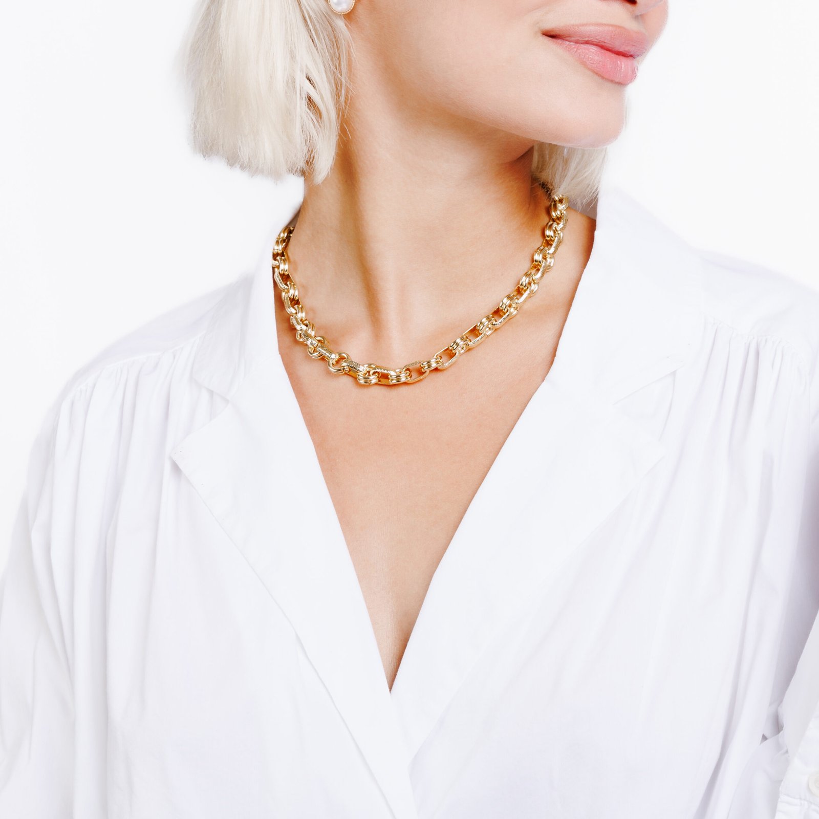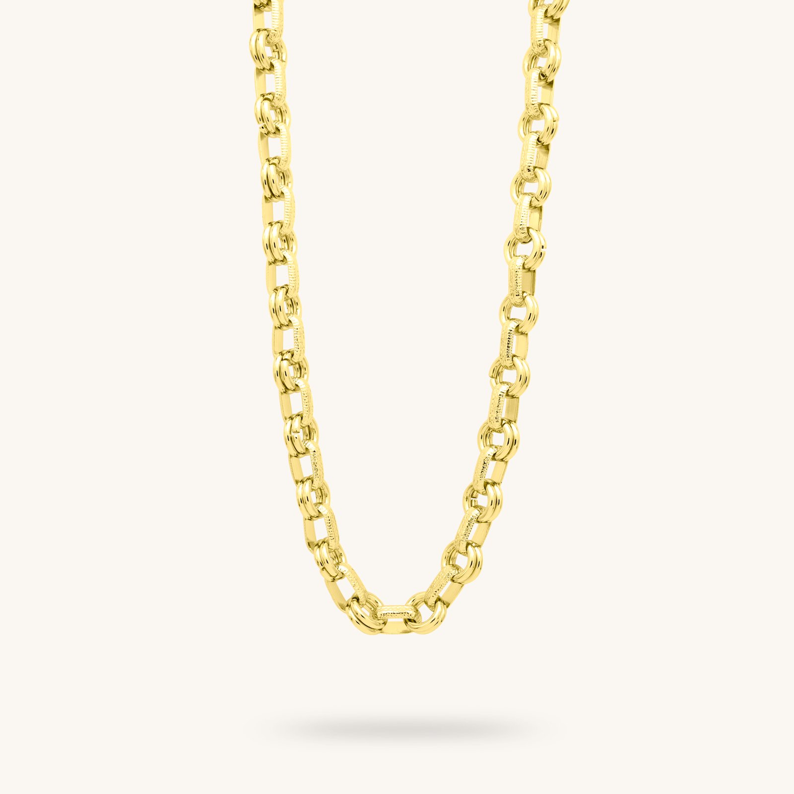 Αναβαθμίστε το στυλ σας με τη χρυσή αλυσίδα της συλλογής μας, που αποτελείται από μια σειρά λείων και σφυρήλατων κρίκων. Αυτό το εκθαμβωτικό χρυσό κολιέ αλυσίδα είναι μια δήλωση κομψότητας και πολυτέλειας. Κάθε κρίκος του κολιέ είναι επιμελώς σχεδιασμένος με δύο διαφορετικές υφές, με λείους και σφυρήλατους κρίκους, που προσθέτουν βάθος και ενδιαφέρον στο συνολικό σχέδιο.