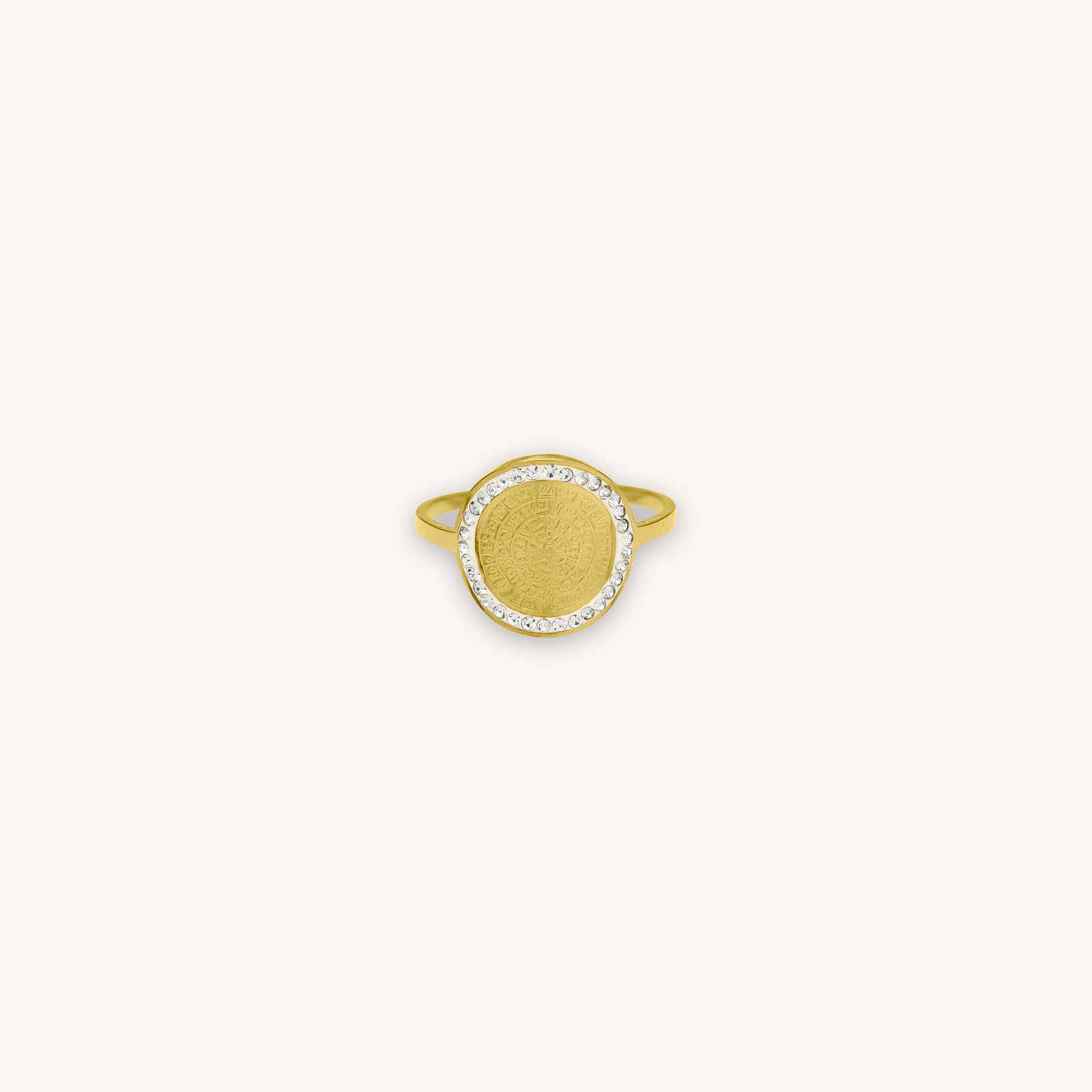 Αναβαθμίστε το στυλ σας με τα εντυπωσιακό χρυσό δαχτυλίδι της συλλογής μας, το οποίο αποτελεί την επιτομή της διαχρονικής ομορφιάς και κομψότητας.Το δαχτυλίδι διαθέτει ένα κομψό κυκλικό σχέδιο στο κέντρο, που απεικονίζει τον Δίσκο της Φαιστού. Το κεντρικό κυκλικό στοιχείο είναι ανάγλυφο, προσθέτοντας βάθος στο κόσμημα. Περιβάλλεται από διακοσμητικά κρύσταλλα που προσθέτουν λάμψη και φινέτσα, δημιουργώντας μια εντυπωσιακή αντίθεση με τη χρυσή απόχρωση. Είναι λιτό και μοντέρνο, καθιστώντας το ιδανικό για καθημερινή χρήση αλλά και για πιο επίσημες εμφανίσεις.