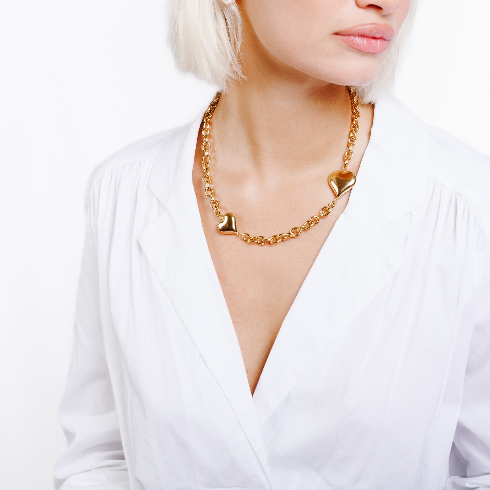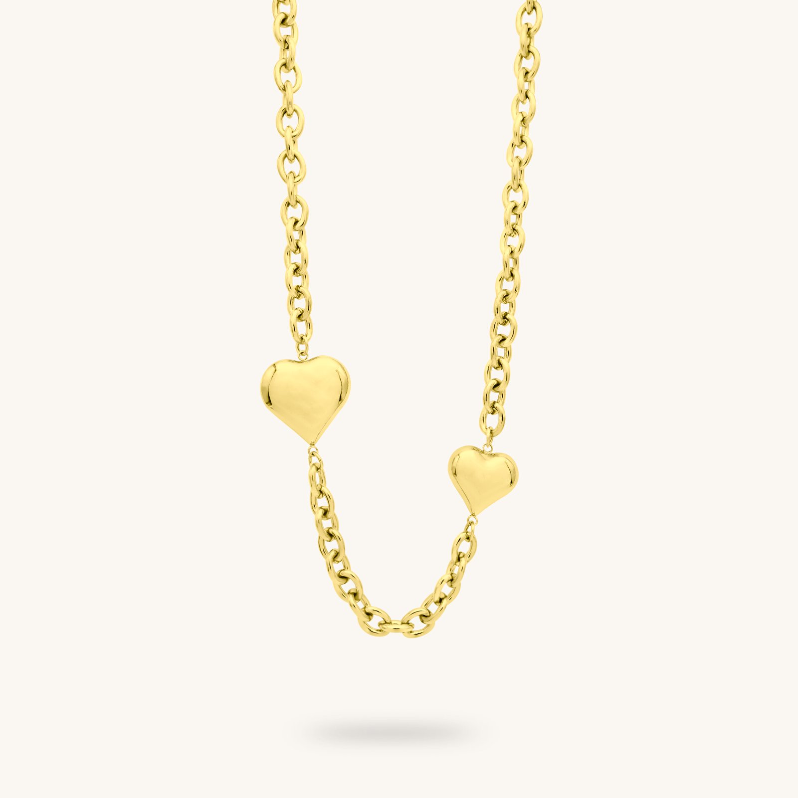 Αναβαθμίστε το στυλ σας με τη χρυσή αλυσίδα της συλλογής μας που τη διακοσμούν όμορφα δυο καρδιές, τοποθετημένες συμμετρικά πάνω της. Το σχέδιο του κολιέ είναι μοντέρνο και ρομαντικό που δένει αρμονικά με τον λαμπερό κίτρινο χρυσό που αποπνέει πολυτέλεια και κομψότητα. Είναι ιδανικό για καθημερινή χρήση και για επίσημες περιστάσεις, καθώς αποτελεί ένα standout κομμάτι για κάθε εμφάνιση.