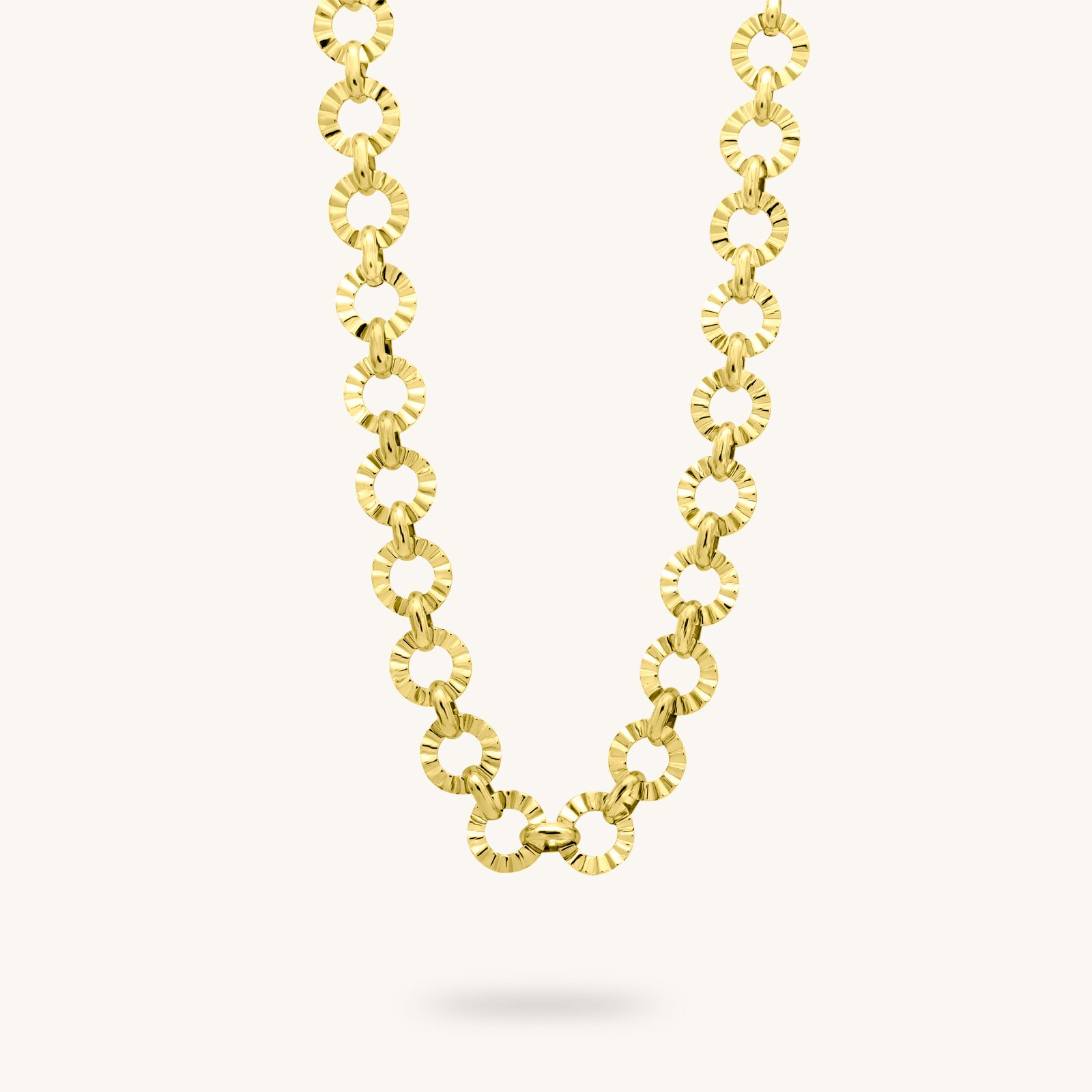 Αναβαθμίστε το στυλ σας με το χρυσό κολιέ της συλλογής μας, διακοσμημένο με ιδιαίτερους συνδετικούς κρίκους. Το σχέδιο του κολιέ είναι μοντέρνο και ξεχωριστό, ενώ οι κρίκοι προσδίδουν μια αίσθηση κίνησης και εκλεπτυσμένης φινέτσας. Το μήκος του κολιέ μπορεί να προσαρμοστεί και να φορεθεί μόνο του ή ως κομμάτι layering, ανάλογα με την περίσταση.