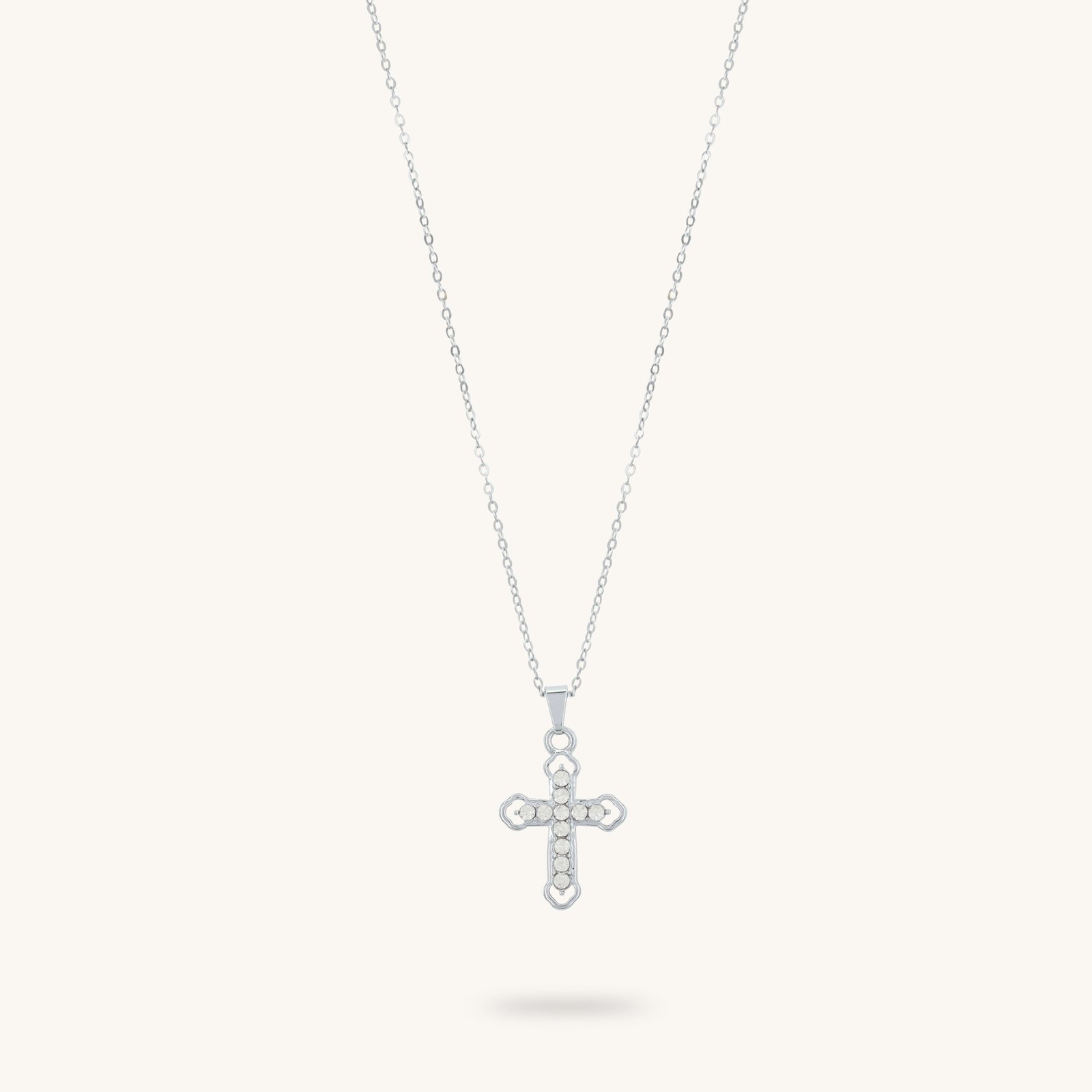 Αναβαθμίστε το στυλ σας με το ασημί κολιέ της συλλογής μας, το οποίο αποπνέει διαχρονική ομορφιά και κομψότητα. Ο σταυρός έχει σχεδιαστεί με προσοχή στη λεπτομέρεια, με κάθε σημείο του να διακοσμείται από λαμπερά ζιργκόν που αναδεικνύουν τον ιδιαίτερο χαρακτήρα του κοσμήματος. Η αλυσίδα είναι λεπτή και διακριτική, επιτρέποντας στον σταυρό να ξεχωρίζει και να τραβάει τα βλέμματα.