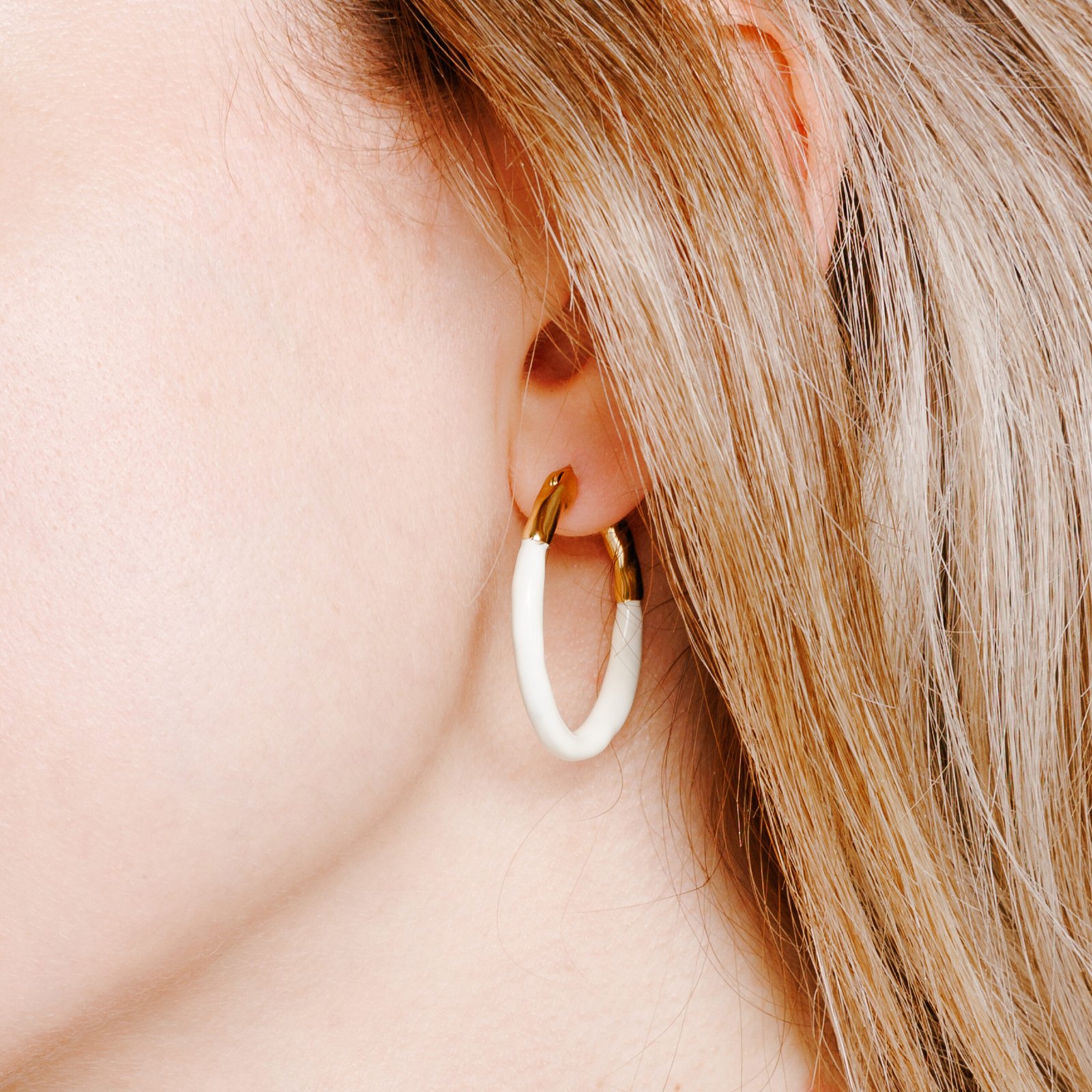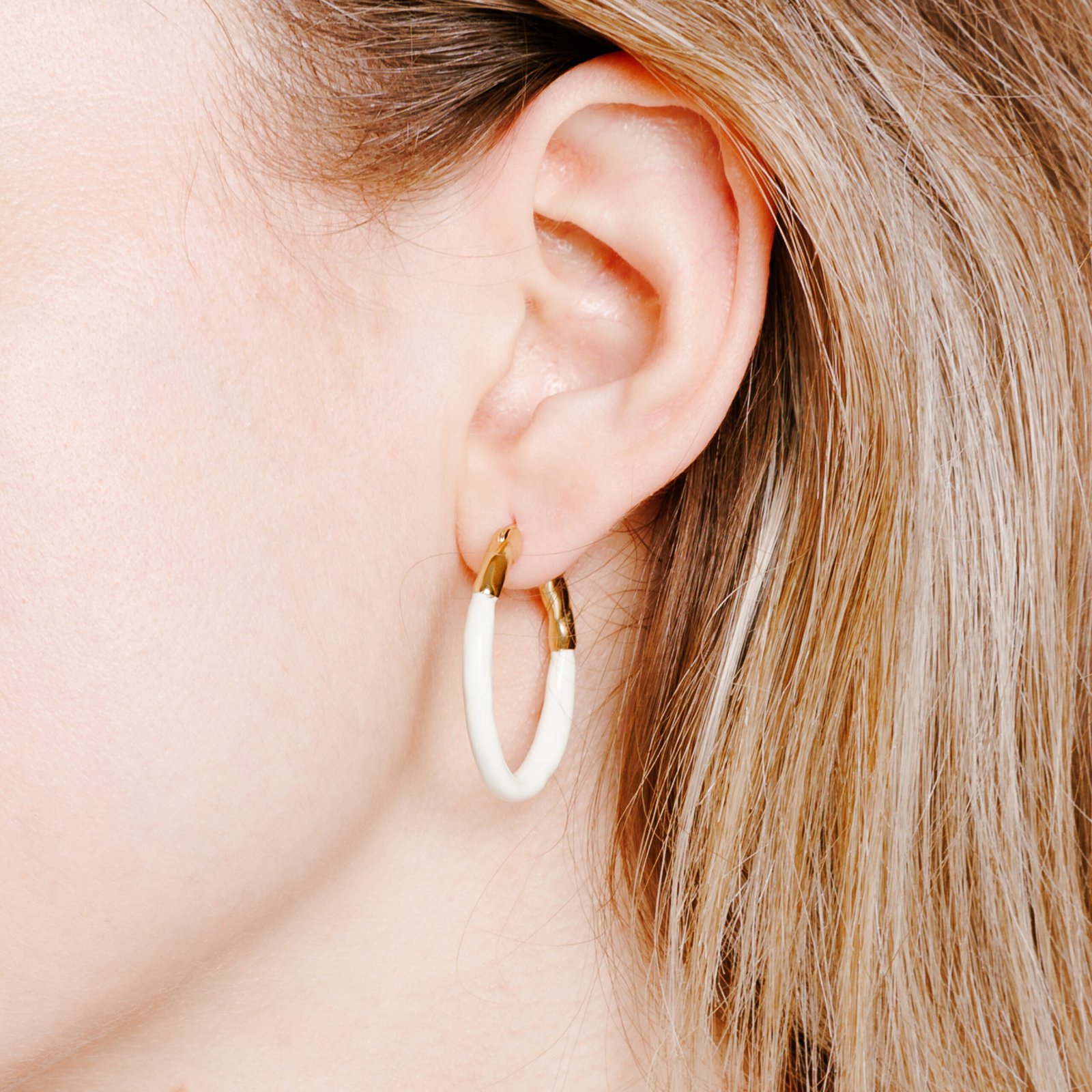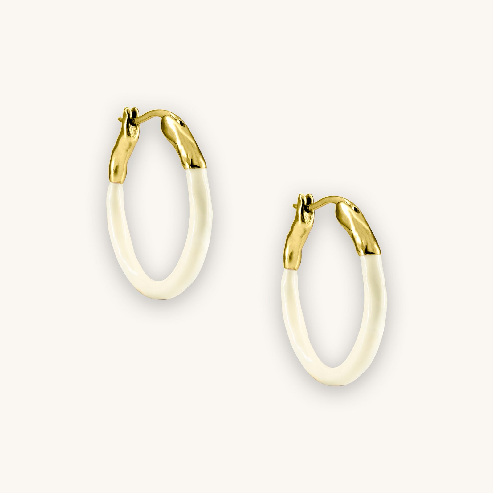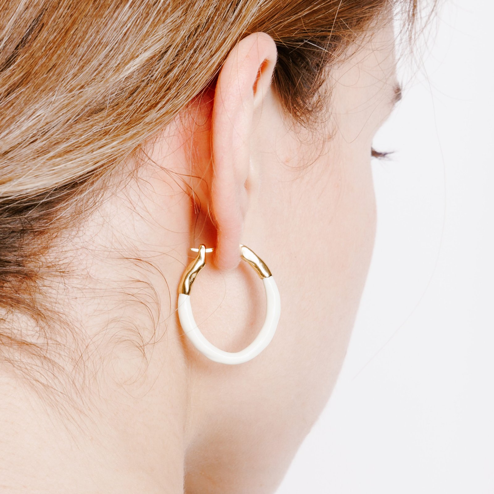 Αναβαθμίστε το στυλ σας με τα εντυπωσιακά σκουλαρίκια της συλλογής μας, τα οποία προσφέρουν μια αίσθηση πολυτέλειας και εκλεπτυσμένου στυλ, ιδανικά για όσες γυναίκες αναζητούν την κλασική κομψότητα με μια μοντέρνα πινελιά. Το σκουλαρίκι διαθέτει λευκή επίστρωση σμάλτου που προσθέτει μια καθαρή και φρέσκια νότα στο κλασικό σχέδιο του κρίκου. Η λευκή απόχρωση δίνει μια κομψή και μοντέρνα αίσθηση. Οι χρυσές λεπτομέρειες στο κλείσιμο του σκουλαρικιού δημιουργούν μια εκθαμβωτική λάμψη και προσθέτουν μια εκλεπτυσμένη αίσθηση πολυτέλειας.