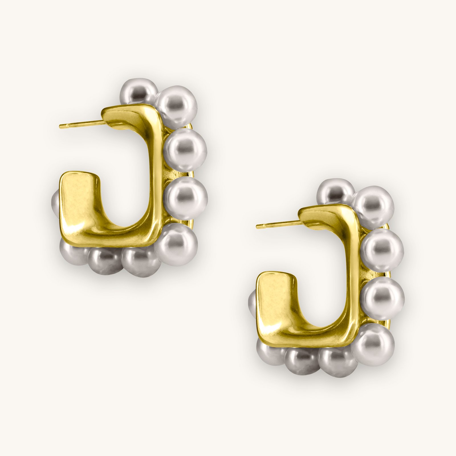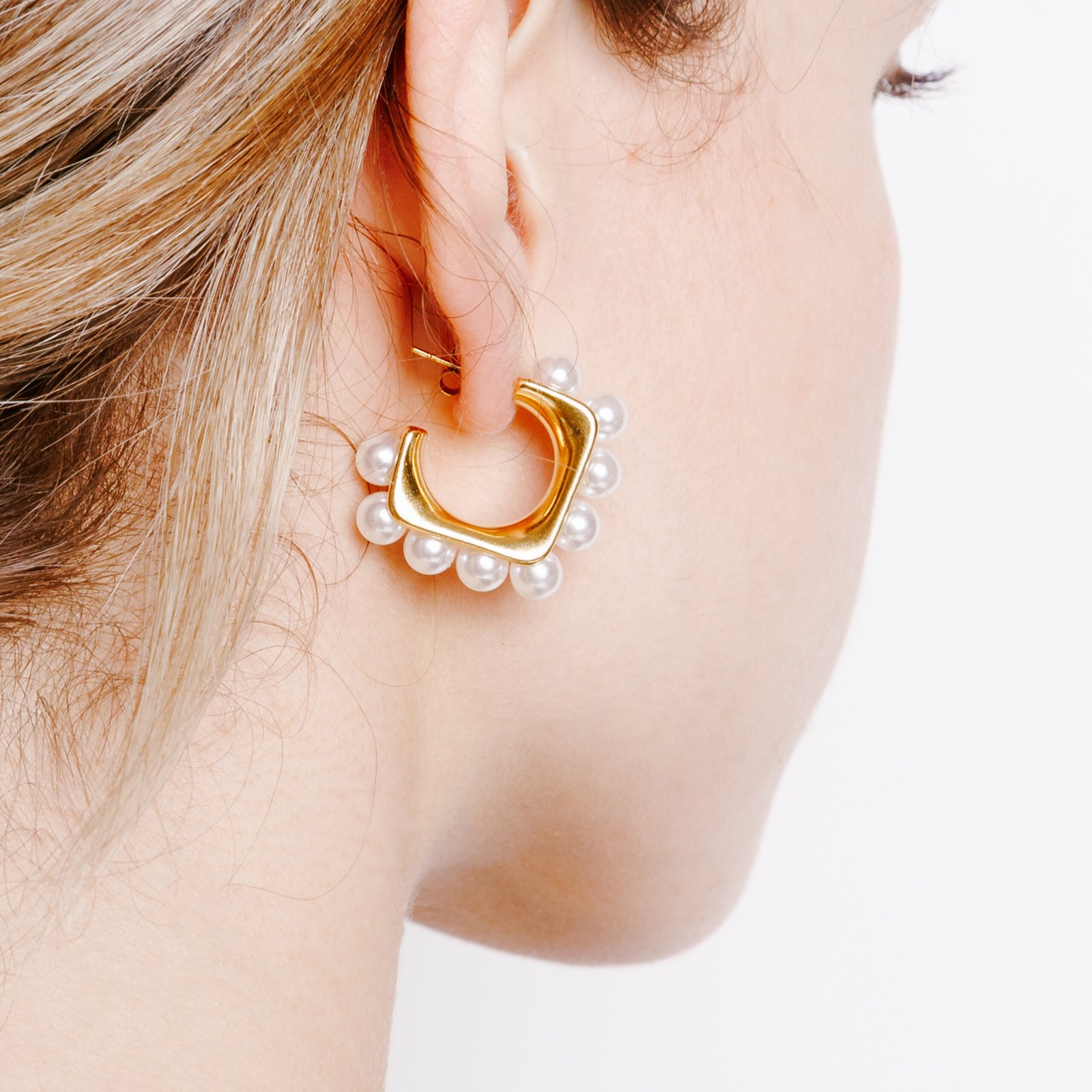 Αναβαθμίστε το στυλ σας με τα εντυπωσιακά σκουλαρίκια της συλλογής μας, τα οποία προσφέρουν μια αίσθηση πολυτέλειας και εκλεπτυσμένου στυλ, ιδανικά για όσες γυναίκες αναζητούν την κλασική κομψότητα με μια μοντέρνα πινελιά. Το σκουλαρίκι είναι διακοσμημένο με πέρλες περιμετρικά, προσδίδοντας μια αίσθηση κομψότητας και φινέτσας. Το χρυσό μέταλλο σχηματίζει ένα ανοικτό τετράγωνο με τις πέρλες να αναδεικνύουν το σχήμα, δημιουργώντας ένα μοντέρνο και ταυτόχρονα κλασικό σχέδιο.